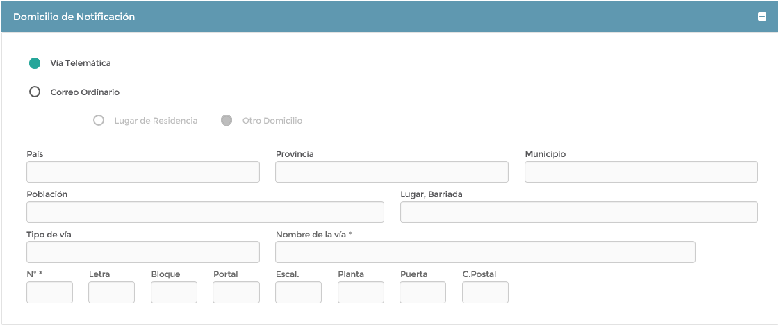 • Otro domicilio. En caso de que queramos recibir las notificaciones en un domicilio distinto al lugar de residencia, marcamos la opción correspondiente e introducimos los datos en el formulario en blanco.